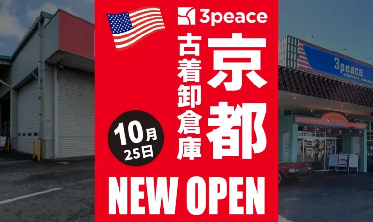 全国で古着倉庫やショップを展開する〈3peace(スリーピース)〉が、京都府宇治市に新店舗「3peace京都古着卸売倉庫」を2025年10月25日(土)にグランドオープン。倉庫型店舗としては全国6店舗目となる。